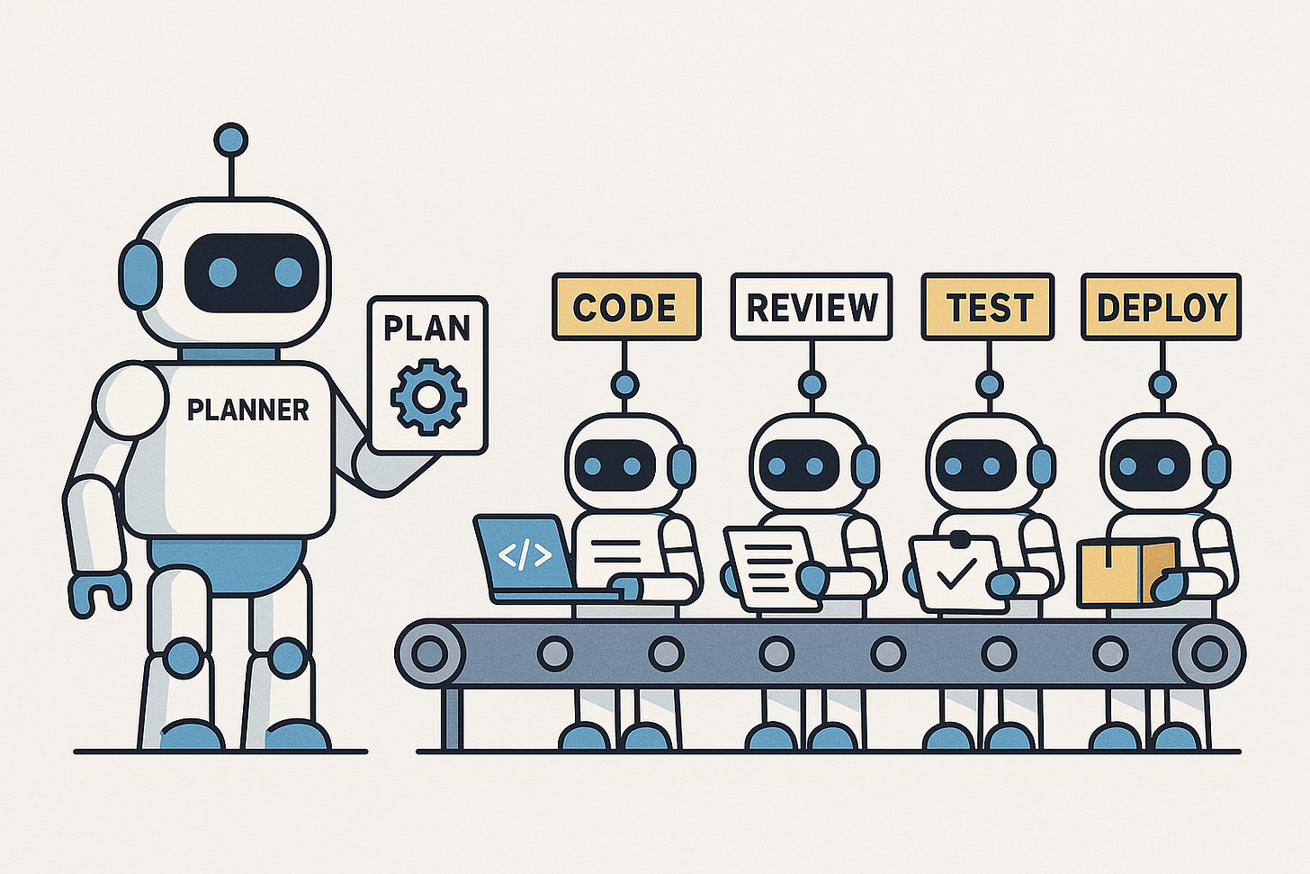 Because complex heterarchical (many-to-many) communication protocols are difficult to coordinate, another good multi-agent pattern is the assembly line. A planner agent might set the agenda, and then each agent in the workflow does its job and passes the result forward, resulting in a progressively developing product. Each agent has its own tools and logic for doing what it does well. Perhaps the final agent inspects the finished product, and if it meets specifications, approves it. Otherwise it might get kicked back to the first step.